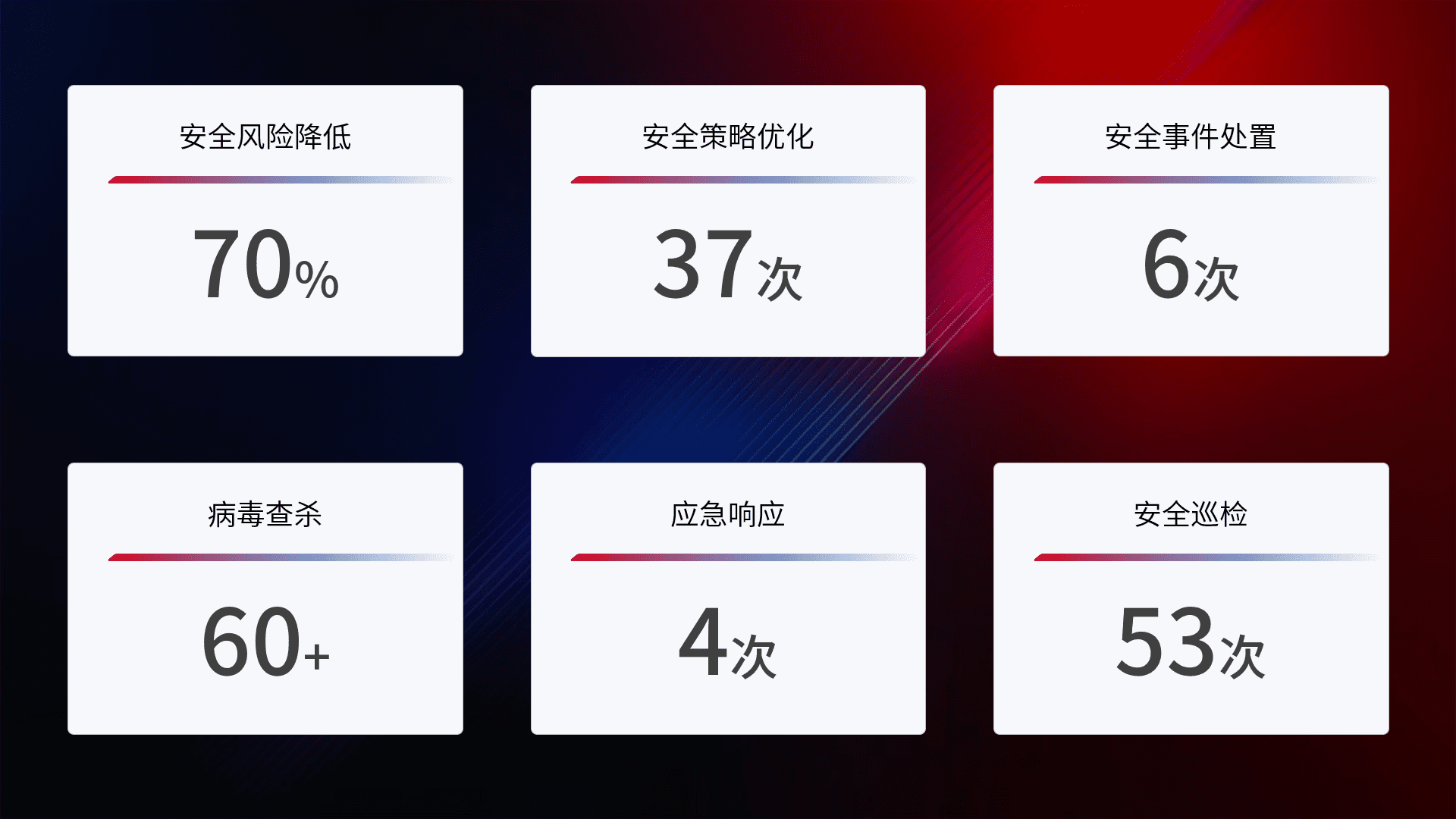 提供全面的安全事件报告体系,,包括处置报告、、周报、、、、季度和年度总结,,,,结合持续监控,,帮助客户深入了解网络安全状况。。。